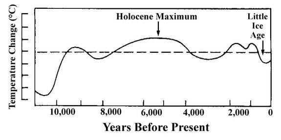 Rond 1875 is de laagste temperatuur sinds 10.000 jaar geleden. Op dat moment begint de mens met het meten van de temperatuur. Het lijkt dan alsof de temperatuur dramatisch stijgt. Maar in de totale grafiek is te zien dat het al warmer is geweest dan het nu is.