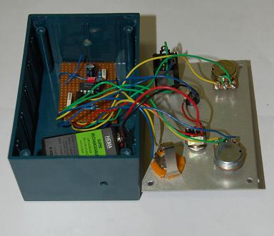 Ik heb eerst alles gesoldeerd, en de potmeters, in- en uitgang en 9 Volt aansuiting gemaakt. Vervolgens heb ik zo de schakeling getest: