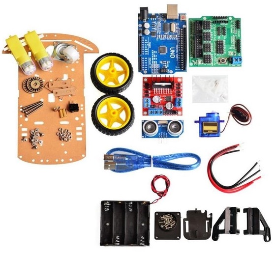In deze kit zitten een Arduino Uno, een Arduino sensor shield, een motor driver, 2 motortjes, servo motor, etc.